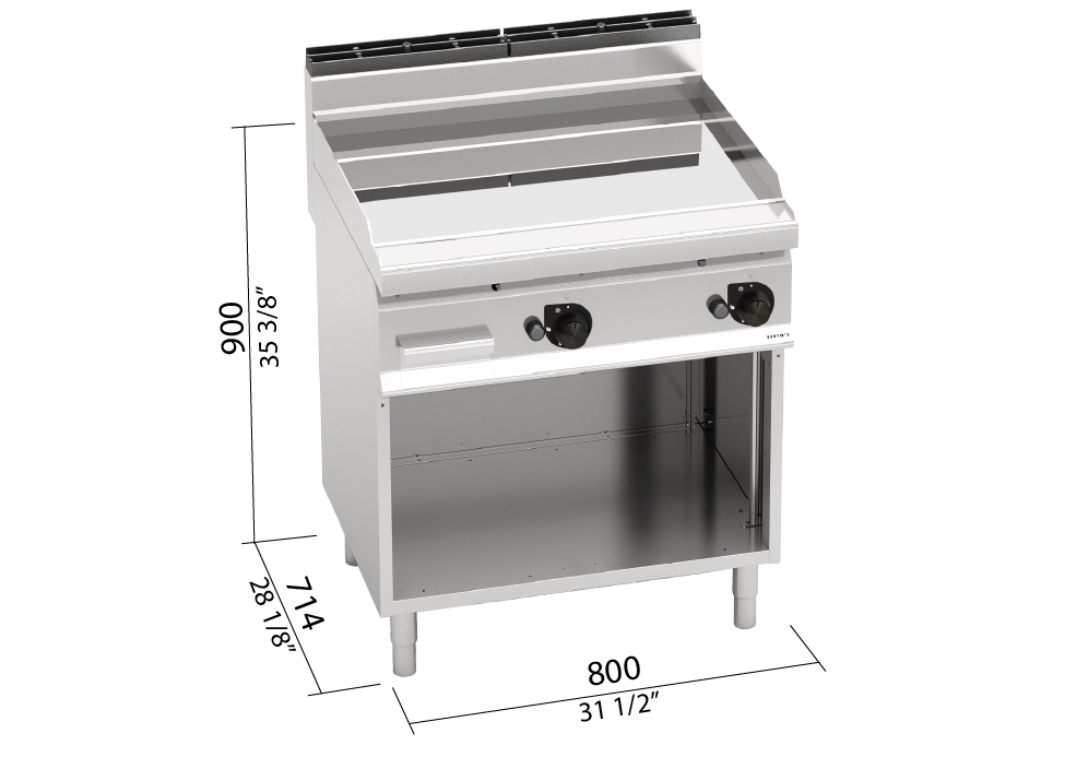 Worktop and front panels from AISI 304 stainless steel. Tubular burners with self-stabilized flame on a large surface for a greater uniformity in heat distribution. Regulation of the supplied power by a thermostat tap. Pilot flame and thermocouple safety valve. Piezoelectric ignition button with silicone protection. Maximum controlled temperature within 280 °C. Very thick smooth plate with flush splashguard. Two-component cooking plate, which combines a steel plate to optimize uniformity with an upper coating in AISI 316 polished stainless steel for easy cleaning and low level of radiation, for greater operator comfort. Two zones with separate controls for independent and optimal temperature regulation. Particularly suitable for delicate cooking. Slightly inclined cooking surface with a large hole to allow drainage of liquid into an appropriate watertight waste container. Adjustable feet.