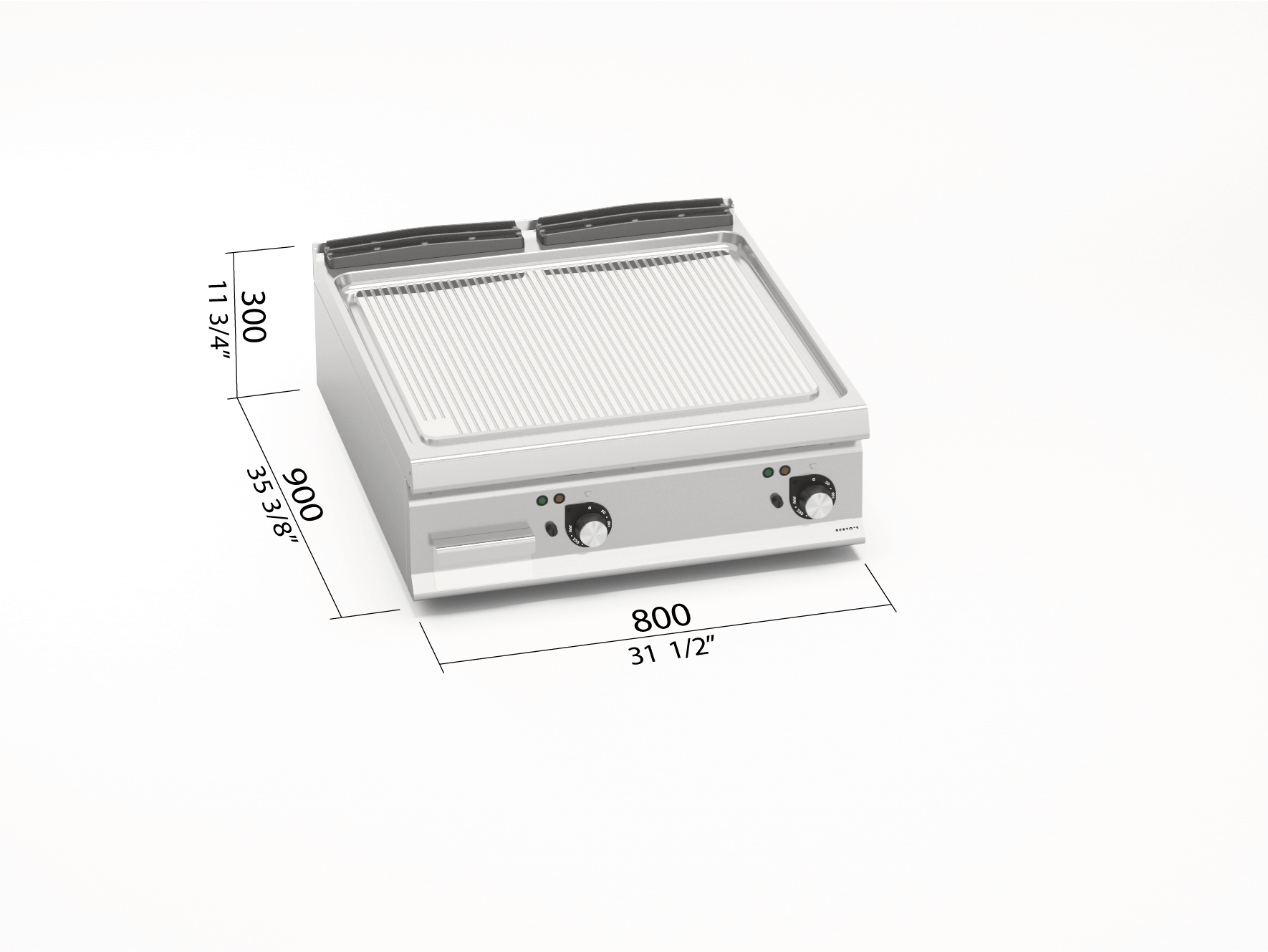 Worktop from AISI 304 stainless steel of 20/10 thickness, front and side panels from AISI 304 stainless steel and Scotch Brite finishing. Incoloy stainless steel resistances positioned below the cooking plate. Thermostatic control and safety thermostat with manual restart. Temperature regulation from 50° C to 270° C. Pilot light and temperature indicator light. High thickness grooved plate occupying the entire worktop surface with flush splashguard. Two zones with separate controls for an independent and perfect regulation of temperature. Dual component cooking plate that combines a steel slab to optimize uniformity and an upper coating in AISI 316 stainless steel with a polished finish that allows easy cleaning and a low level of irradiation giving higher comfort to the operator. Slightly inclined cooking surface with a large drain hole and conveyor to a proper sealed container.
