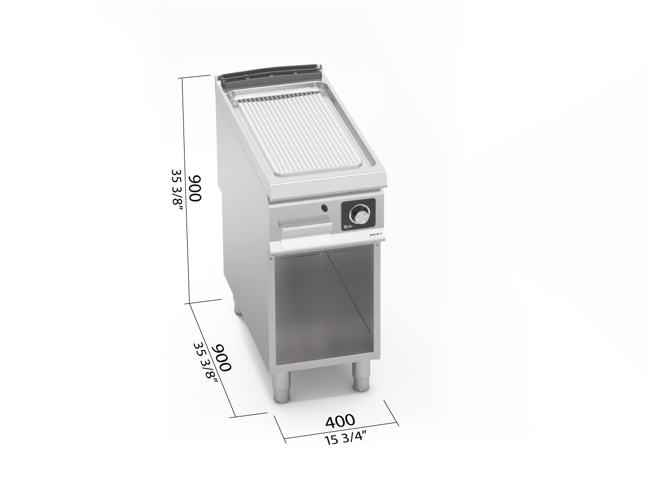 Worktop from AISI 304 stainless steel of 20/10 thickness, front and side panels from AISI 304 stainless steel and Scotch Brite finishing. Incoloy stainless steel resistances positioned below the cooking plate. Bflex electronic controls with temperature regulation from 50 to 300 °C, safety thermostat with manual restart. High thickness grooved plate occupying the entire worktop surface with flush splashguard. Dual component cooking plate that combines a steel slab to optimize uniformity and an upper coating in AISI 316 stainless steel with a polished finish that allows easy cleaning and a low level of irradiation giving higher comfort to the operator. Large drain hole and conveyor to a proper sealed container. Large compartment completely in steel.
